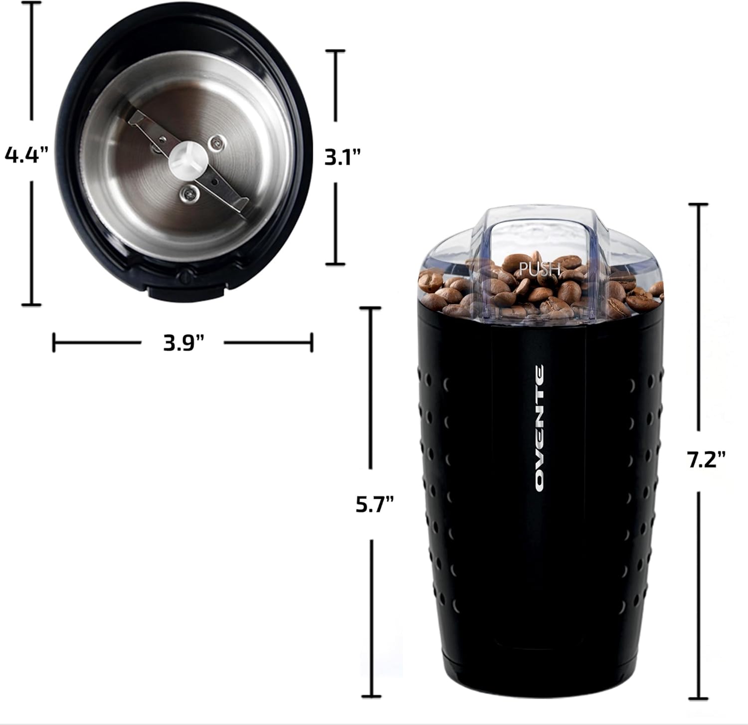 OVENTE Electric Coffee Grinder, Coffee Mill and Spice Grinder with 2.5oz Capacity, 150W Motor, One Touch Push-Button & Stainless Steel Blades for Uniform Grinding of Beans, Herb or Nuts, Black CG225B