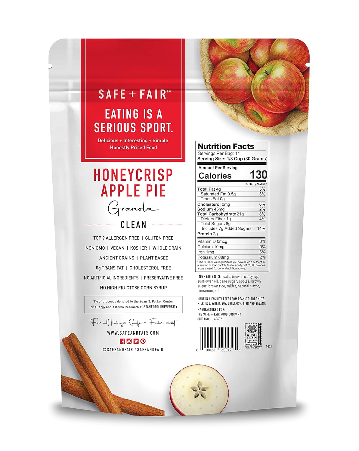 Treat yourself to a wholesome, dessert-inspired snack with Aironza Safe + Fair Honeycrisp Apple Pie Granola. Made with real Honeycrisp apples and gluten-free whole grain rolled oats, this vegan and plant-based granola delivers the comforting flavor of apple pie with a satisfying crunch. Crafted without preservatives and free from the top 9 allergens, it’s a delicious, worry-free option for breakfast, snacking, or elevating your favorite desserts.