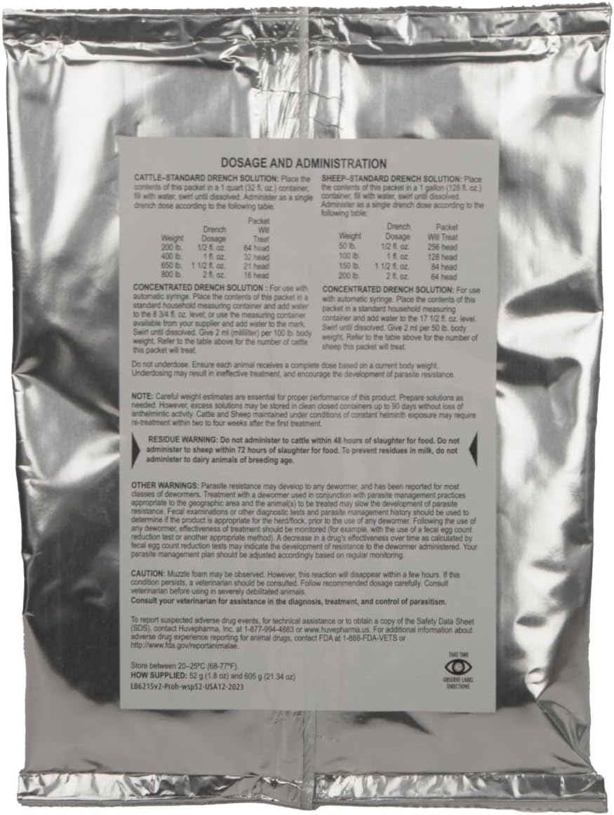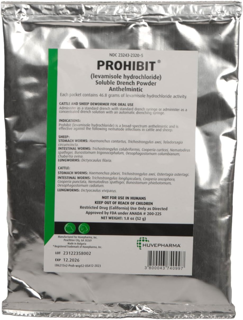 Prohibit® Soluble Drench Powder by Agrilabs is a cost-effective, broad-spectrum anthelmintic formulated for the control of lungworms, stomach worms, and intestinal worms in cattle (bovine) and sheep (ovine). It provides targeted parasite control with a short withdrawal time, supporting healthier livestock and improved productivity.